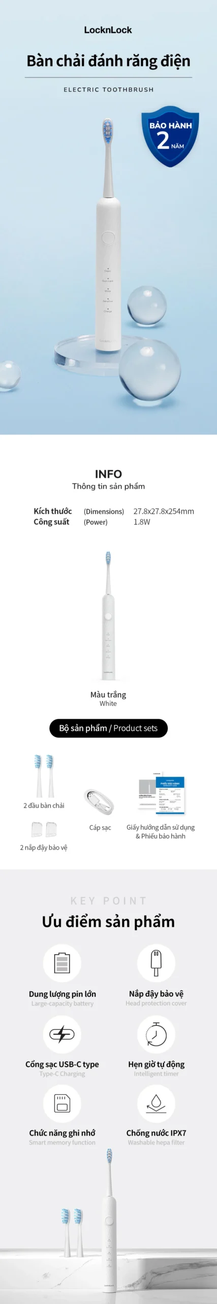 Đặc biệt, bàn chải điện LocknLock sử dụng pin sạc tiện lợi, tuổi thọ cao và dễ dàng thay thế đầu bàn chải, giúp bạn duy trì thói quen vệ sinh răng miệng khoa học, tiết kiệm và an toàn hơn.