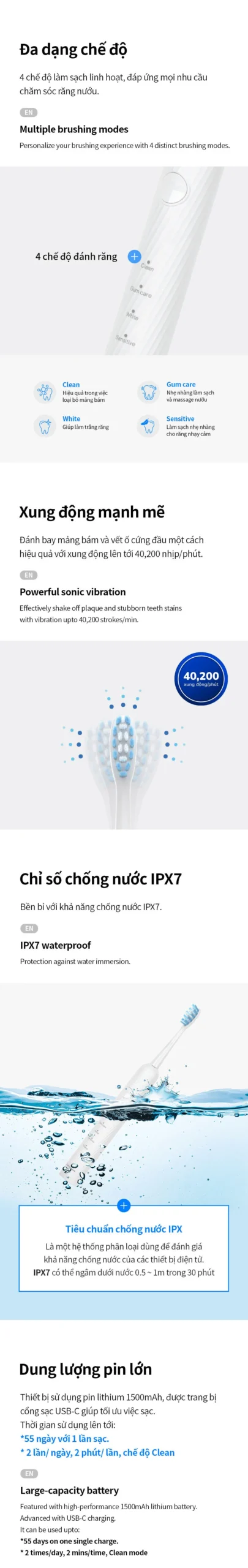 Thiết kế màu trắng tinh tế, nhỏ gọn và tiện lợi, phù hợp cho cả nam và nữ, từ trẻ em đến người lớn. Bàn chải có nhiều chế độ làm sạch, đáp ứng đa dạng nhu cầu như làm sạch sâu, chăm sóc nướu hay làm trắng răng.