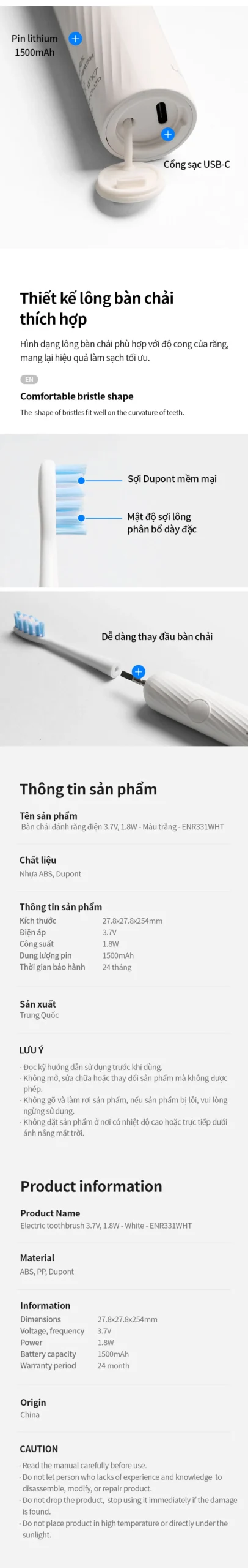 Bàn chải đánh răng điện LocknLock ENR331WHT được thiết kế hiện đại, sử dụng công nghệ rung sóng âm giúp làm sạch răng miệng tối ưu hơn so với bàn chải thông thường. Với công suất 3.7V – 1.8W, sản phẩm mang đến lực rung mạnh mẽ nhưng êm ái, giúp loại bỏ mảng bám, thức ăn thừa và bảo vệ nướu hiệu quả.