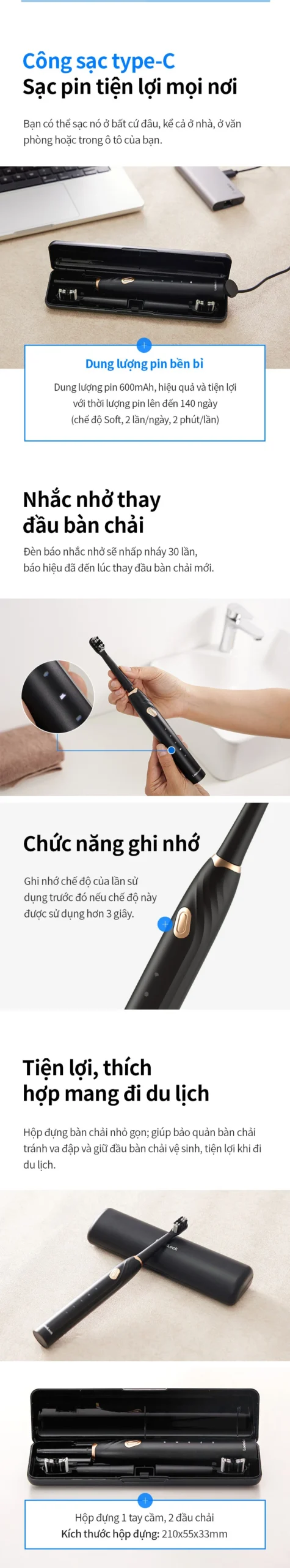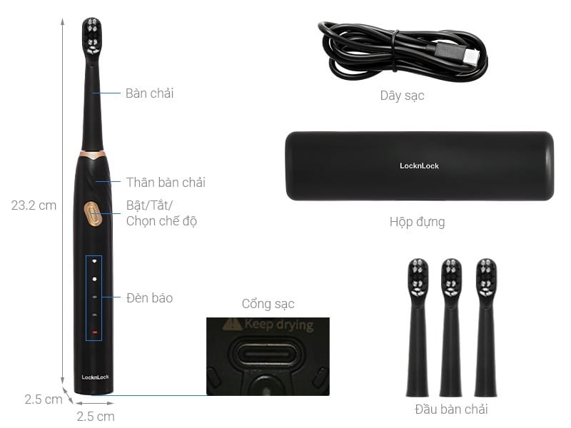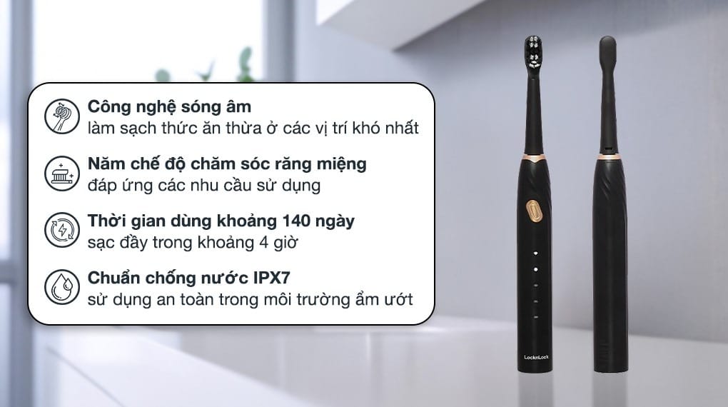 Bàn chải đánh răng điện LocknLock ENR321BLK với thiết kế màu đen sang trọng, hiện đại, trang bị động cơ DC3.7V, công suất 1W mạnh mẽ, mang lại khả năng làm sạch vượt trội. Công nghệ rung sóng âm giúp loại bỏ mảng bám và vi khuẩn hiệu quả, đồng thời bảo vệ nướu và men răng một cách nhẹ nhàng.
