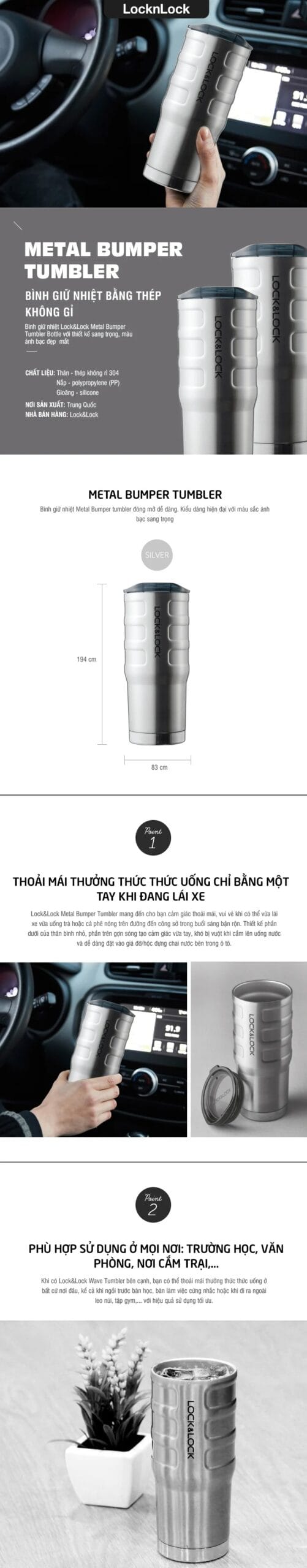 Bình Giữ Nhiệt Lock&Lock Bumper Tumbler – Màu Bạc (550ml, 580ml) – LHC4139, LHC4140 là lựa chọn lý tưởng cho những ai yêu thích sự bền bỉ, tiện lợi và phong cách hiện đại. Với thiết kế mạnh mẽ, chất liệu thép không gỉ cao cấp cùng khả năng giữ nhiệt vượt trội, sản phẩm giúp bạn thoải mái mang theo đồ uống yêu thích cả ngày dài.