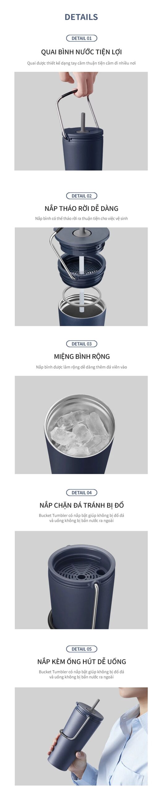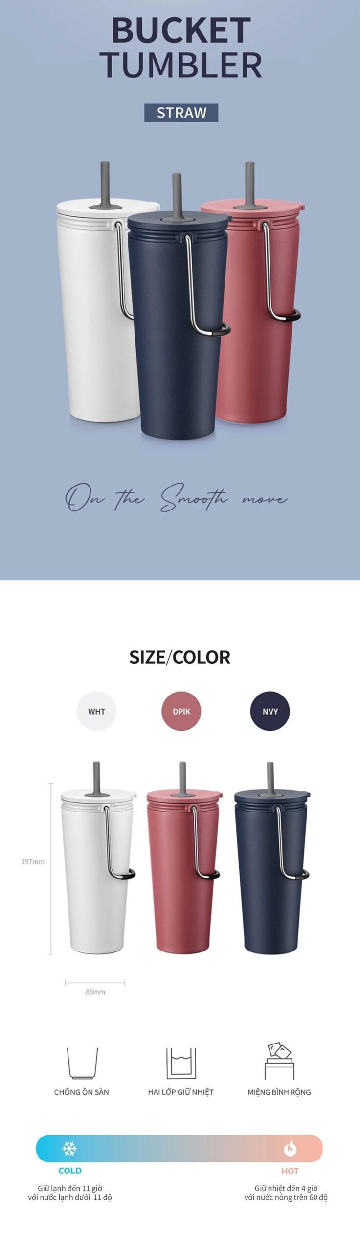Bình Giữ Nhiệt LocknLock Bucket Tumbler With Straw – LHC4268 thiết kế dạng bucket kèm ống hút tiện lợi, phù hợp cho trà, cà phê, nước trái cây hay nước lạnh. Thân bình bằng thép không gỉ SUS304 cao cấp, cấu tạo 2 lớp giúp giữ lạnh đến 12 giờ và giữ nóng khoảng 4 giờ. Nắp nhựa PP chắc chắn, có ngăn lọc đá, chống tràn hiệu quả. Ba màu sắc thời trang Hồng Đậm, Xanh Navy, Trắng cho bạn thoải mái lựa chọn.