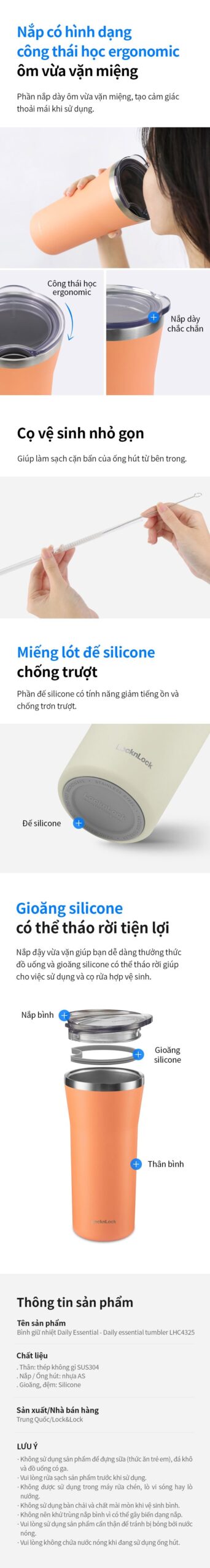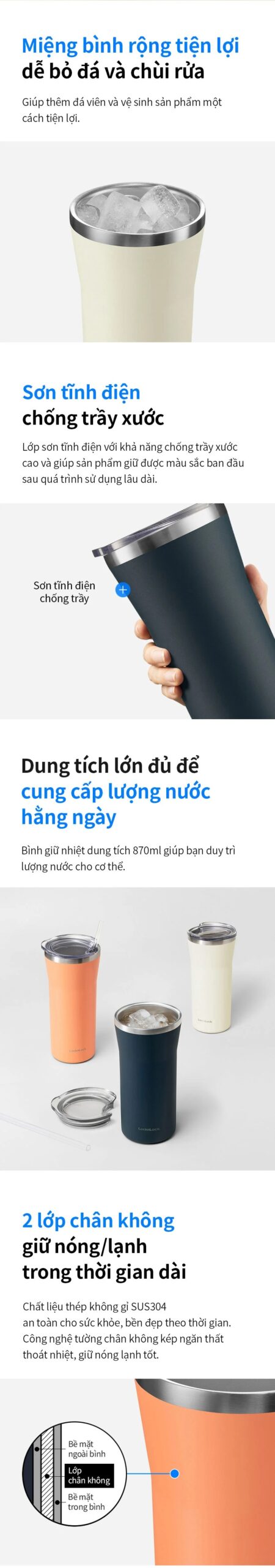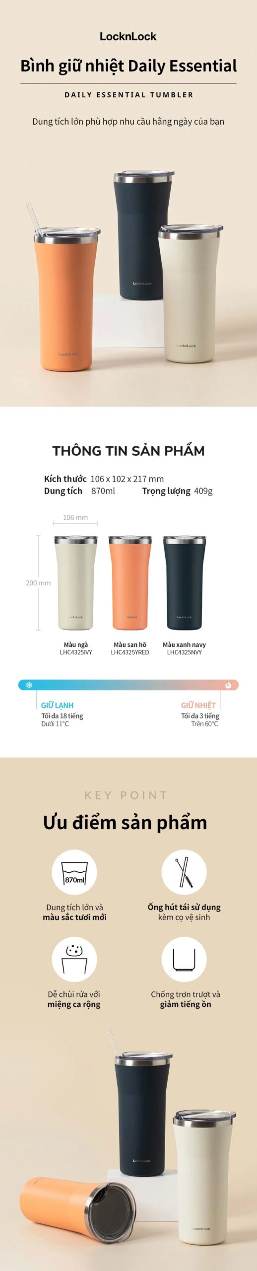 Bình giữ nhiệt Daily Essential LHC4325 có dung tích lớn khoảng 870 ml, phù hợp để sử dụng cả ngày cho dân văn phòng, sinh viên hay lái xe. Thân bình bằng inox 304 kép chân không giúp giữ nóng đến 3 giờ và giữ lạnh đến 18 giờ, đối với đồ uống lạnh thì giữ được nhiệt lâu hơn. Thiết kế thân hình cốc với đường cong ôm tay chắc chắn, kèm ống hút và cọ rửa tiện lợi cho việc sử dụng và vệ sinh. Nắp trong suốt công thái học có gioăng silicone chống rò rỉ, miệng rất rộng giúp cho đá viên và lau chùi dễ dàng. Sản phẩm có ba màu thời trang: Ngà, San Hô và Xanh Navy