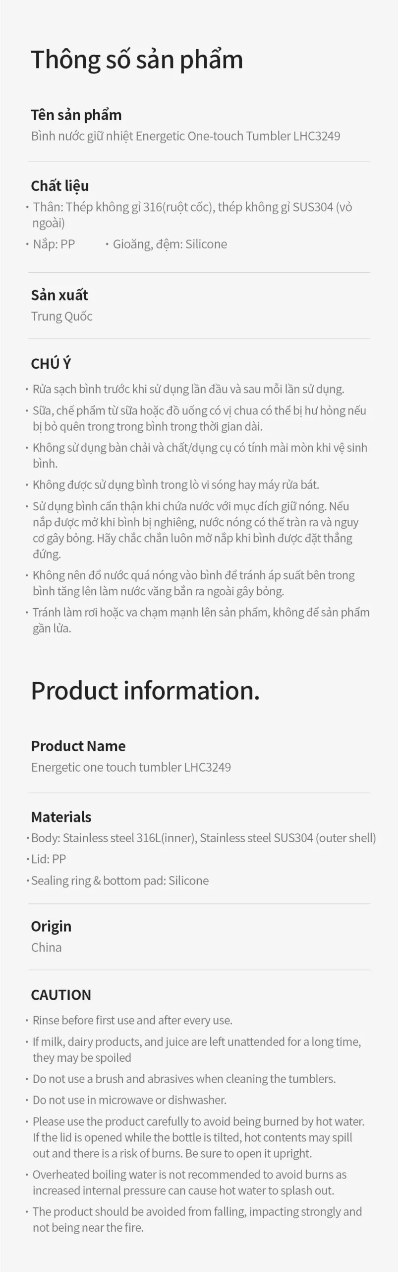 | Lưu ý khi sử dụng | ● Không đựng sữa, thức ăn trẻ em, đá khô hoặc đồ uống có gas. ● Tránh sử dụng bàn chải cứng hoặc chất mài mòn để vệ sinh. ● Không khử trùng nắp bình bằng nước nóng trong thời gian dài, tránh làm biến dạng. ● Không đổ nước quá đầy, giữ mực nước thấp hơn ren miệng cốc. ● Sử dụng cẩn thận để tránh bỏng do nước nóng. ● Tránh đổ nước quá nóng để ngăn áp suất tăng cao gây nước bắn ra ngoài. ● Không làm rơi, va đập mạnh hoặc đặt sản phẩm gần nguồn lửa. |