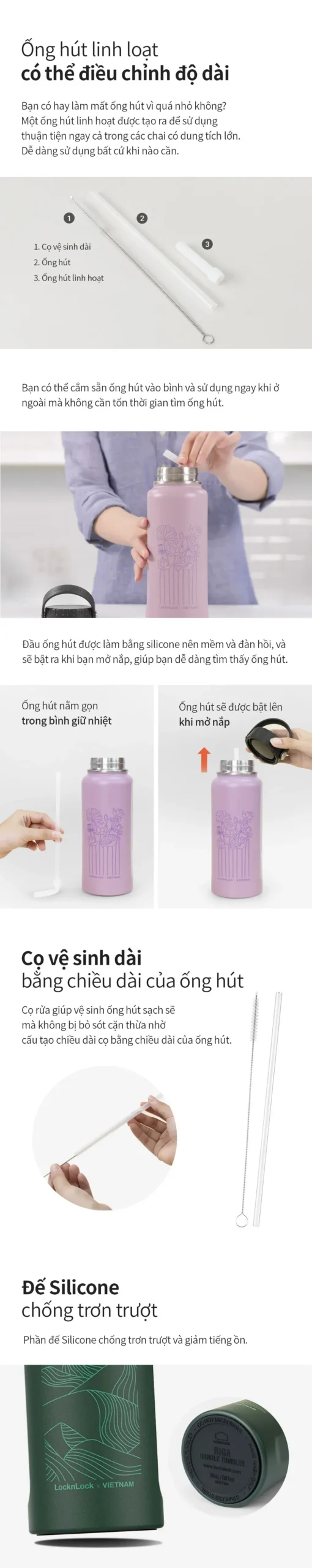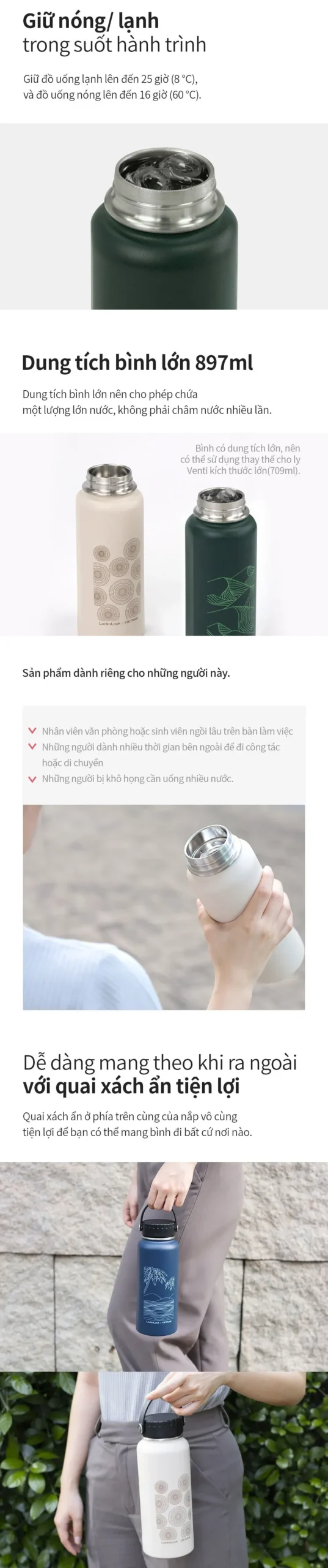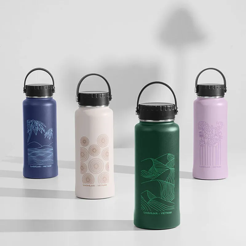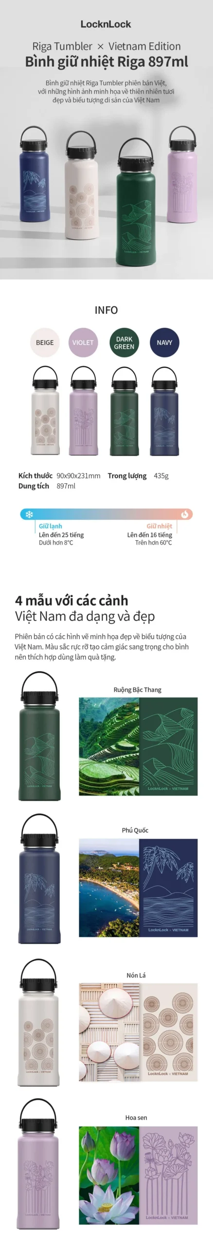 Bình giữ nhiệt LocknLock Riga Tumbler phiên bản Việt Nam LHC4160 mang thiết kế đặc biệt với 4 họa tiết lấy cảm hứng từ văn hóa và thiên nhiên Việt Nam: Xanh lá ruộng bậc thang, Xanh Navy Phú Quốc, Be nón lá và Tím hoa sen. Với dung tích lớn 897ml, sản phẩm đáp ứng nhu cầu uống nước cả ngày, phù hợp cho học tập, làm việc hay du lịch. Thân bình được làm từ thép không gỉ SUS304 hai lớp chân không giúp giữ lạnh tới 25 giờ và giữ nóng đến 16 giờ. Nắp bình chắc chắn, có quai cầm tiện lợi, kèm đế silicone chống trượt và bộ lọc inox dễ dàng sử dụng.