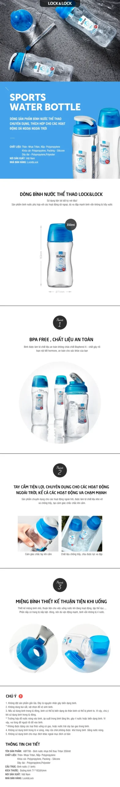 Với Bình nước Tritan LocknLock 350ml ABF708, bạn sẽ có một sản phẩm nhẹ – bền – đẹp – an toàn, đồng hành trong mọi hoạt động hằng ngày.