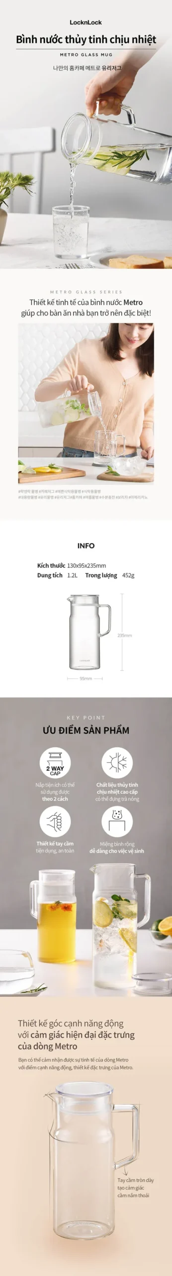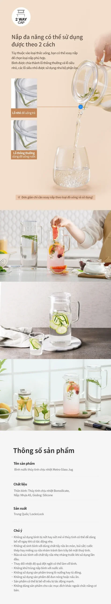 Sản phẩm dễ vệ sinh, không bám mùi, không chứa BPA, đảm bảo an toàn tuyệt đối cho sức khỏe người dùng. Bình thủy tinh LocknLock Metro Glass Jug không chỉ hữu ích trong gian bếp mà còn là vật dụng trang trí tinh tế trên bàn ăn và trong các buổi tiệc.