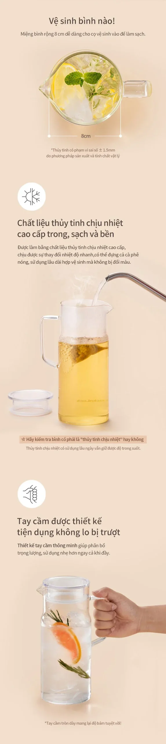 Thiết kế trong suốt sang trọng, dung tích 1.2 lít rộng rãi, phù hợp dùng để đựng nước lọc, trà, nước trái cây hoặc các loại đồ uống yêu thích. Phần tay cầm chắc chắn kết hợp với miệng rót thông minh, giúp rót nước dễ dàng, không lo tràn đổ.