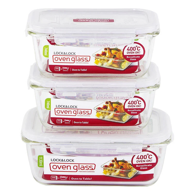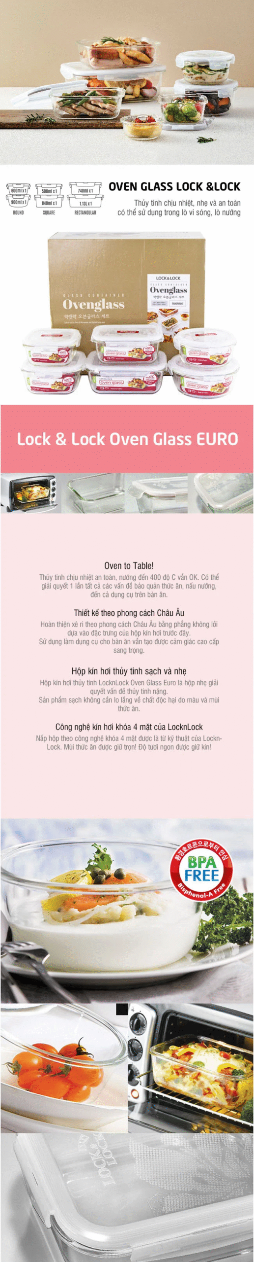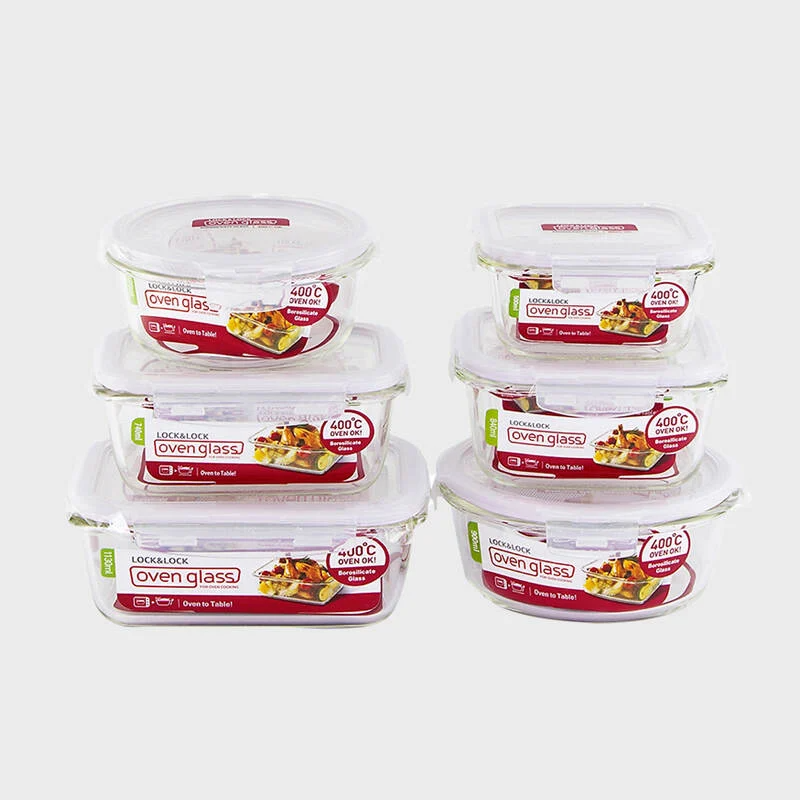 Bộ 6 hộp thủy tinh LocknLock Euro LLG429S6 gồm các hộp đa kích thước từ 500 ml đến 1,13 L, làm từ thủy tinh Borosilicate chịu nhiệt cao. Nắp khóa 4 cạnh kết hợp gioăng silicone giúp kín hơi, chống tràn và giữ mùi thực phẩm. Thích hợp sử dụng trong lò vi sóng, tủ lạnh, và bảo quản thức ăn hằng ngày. Thiết kế trong suốt, sang trọng, tiện lợi cho gia đình hiện đại và mang đi làm hay dã ngoại.