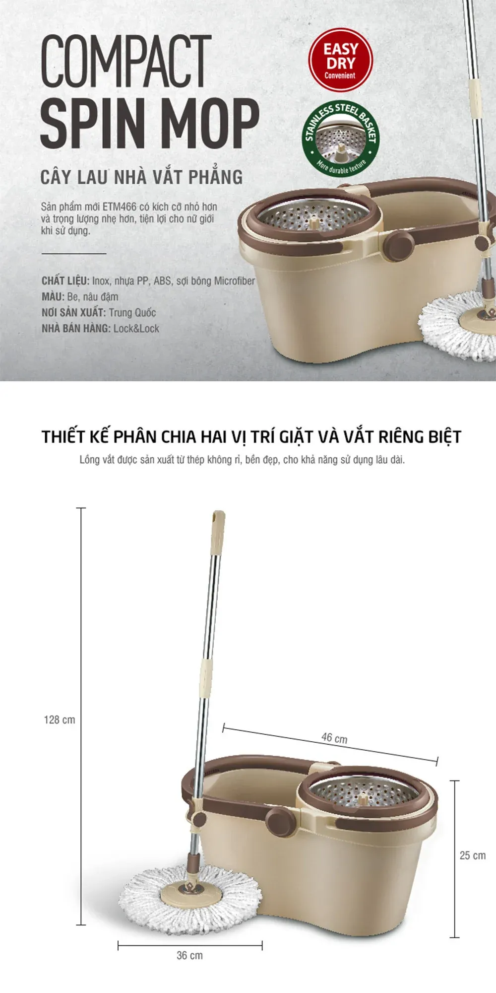 Bộ lau nhà Lock&Lock Compact Spin Mop ETM466 mang thiết kế nhỏ gọn, tiện lợi với khả năng xoay tay dễ dàng vắt khô bông lau mà không cần dùng nhiều sức. Sản phẩm gồm thùng giặt, cây lau và bông lau, đáp ứng nhu cầu vệ sinh nhà cửa nhanh chóng, tiết kiệm thời gian và công sức.
