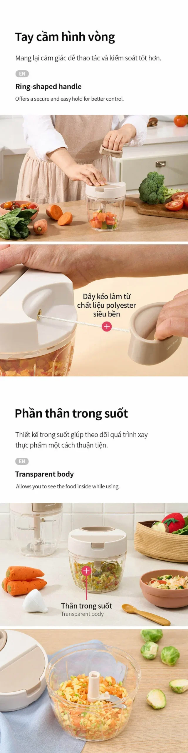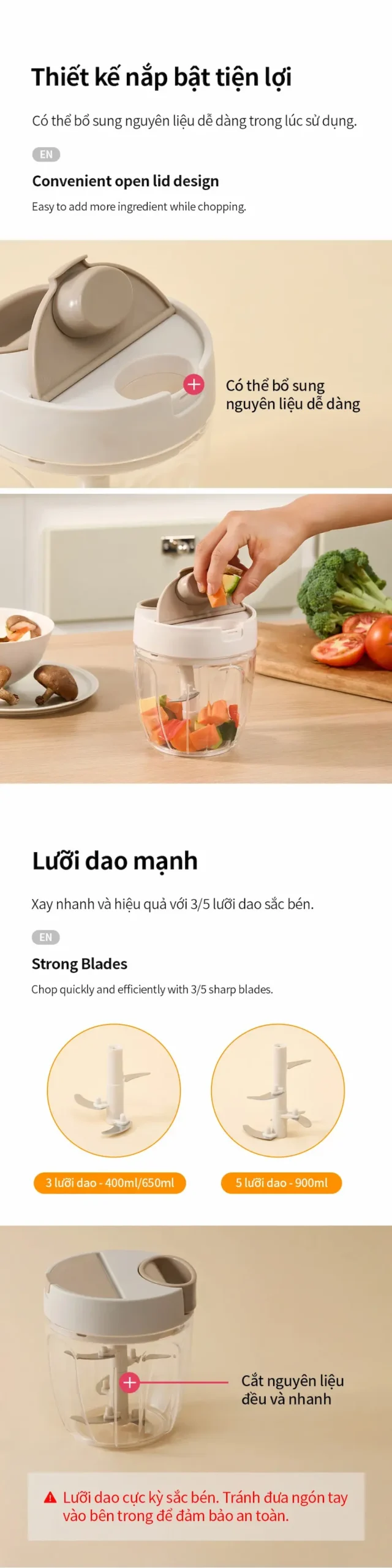 Dụng cụ băm nhỏ thực phẩm có nắp bật giúp việc chế biến trở nên nhanh chóng và tiện lợi.