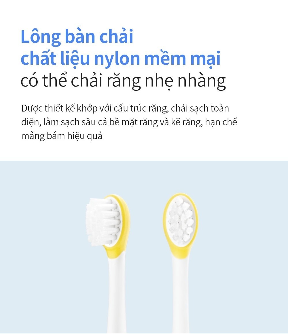 Thiết kế đầu bàn chải nhỏ gọn, dễ dàng tiếp cận từng kẽ răng và vùng răng hàm trong, hỗ trợ loại bỏ mảng bám, thức ăn thừa và vi khuẩn. Nhờ đó, bé sẽ có hàm răng khỏe mạnh, hơi thở thơm mát và thói quen chăm sóc răng miệng tốt ngay từ nhỏ.
