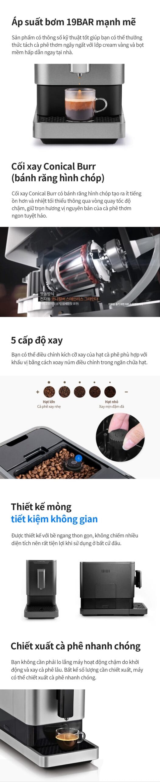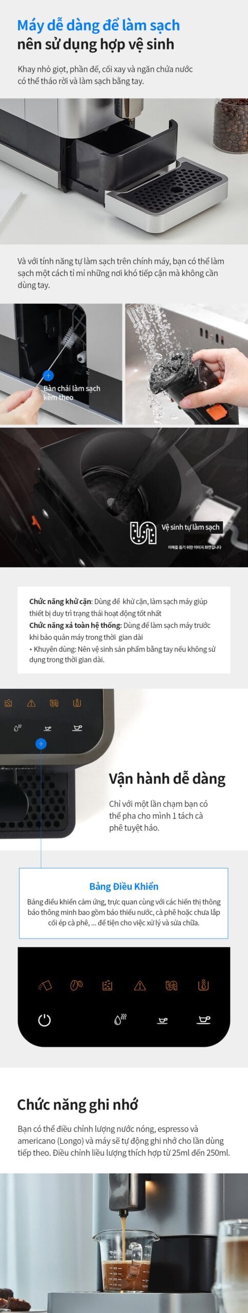 - Bảo trì và vệ sinh: Với các bộ phận có thể tháo rời như khay nhỏ giọt và bình chứa nước, việc vệ sinh máy trở nên đơn giản và thuận tiện. Máy còn có chức năng tự động xả nước và khử cặn, giúp kéo dài tuổi thọ của máy và đảm bảo vệ sinh trong quá trình sử dụng.