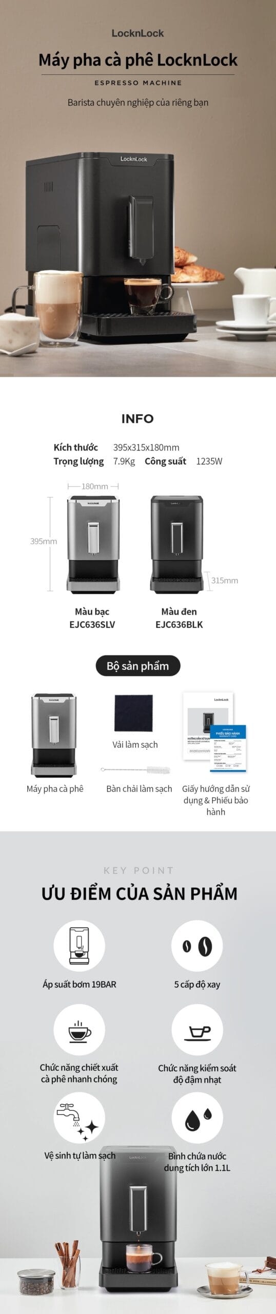 - Thiết kế nhỏ gọn và sang trọng: Với chiều rộng chỉ 180mm, máy EJC636 dễ dàng tìm chỗ đứng trong bất kỳ không gian nào mà không gây cảm giác chật chội. Máy có hai tùy chọn màu sắc là đen và bạc, phù hợp với nhiều sở thích khác nhau, từ cổ điển đến hiện đại.
