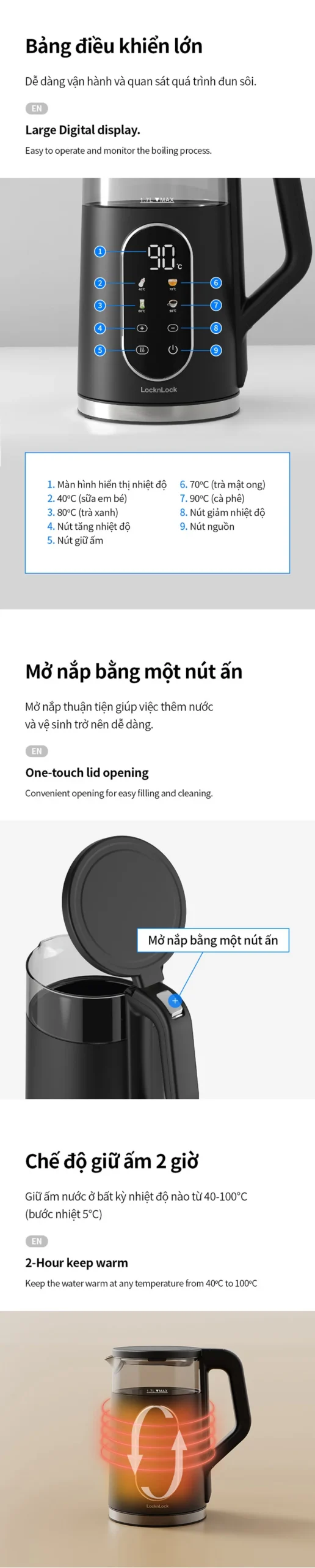 CHẾ ĐỘ GIỮ ẤM 2 GIỜ: Giữ ấm nước ở bất kỳ nhiệt độ nào từ 40-100°C (bước nhiệt 5°C)
