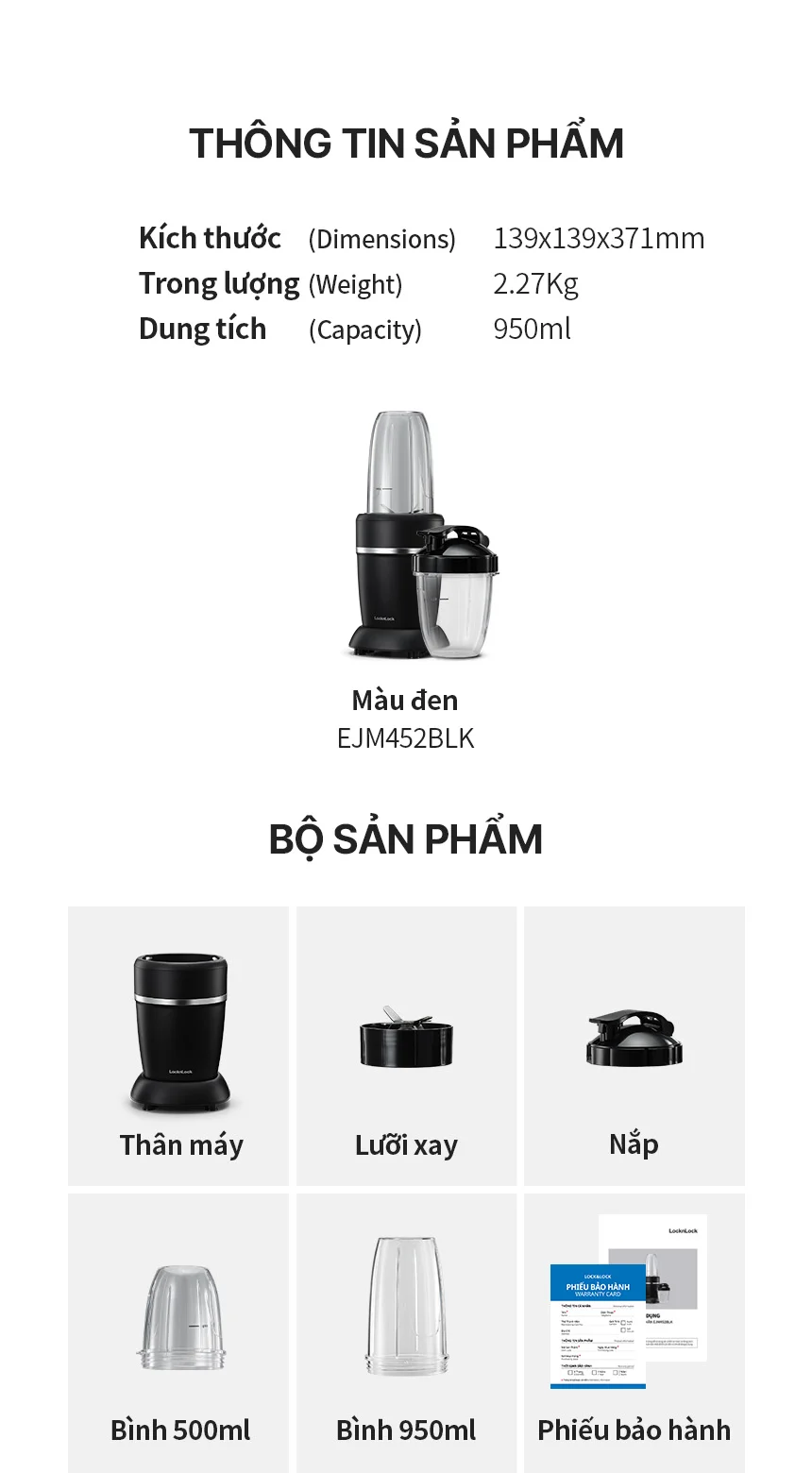 | Bộ sản phẩm | Thân máy, bình 500ml, bình 950ml, nắp |