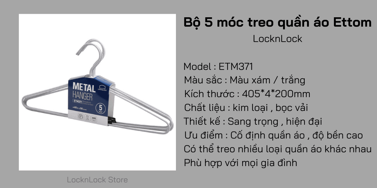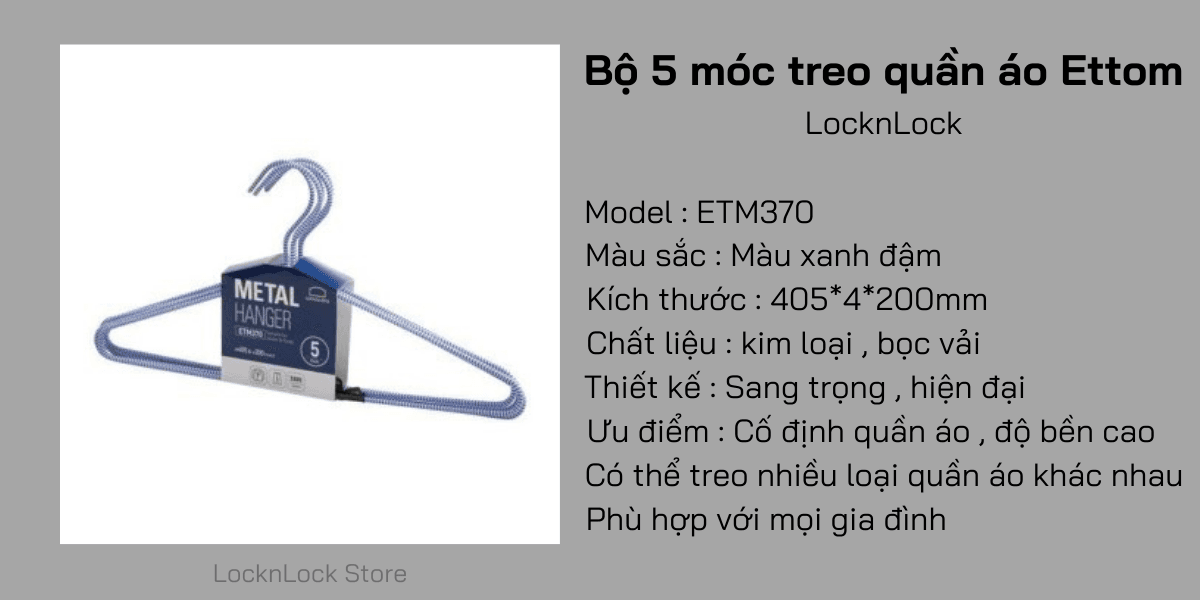 ETM370, ETM371 – Bộ 5 Móc Treo Quần Áo Ettom LocknLock Bằng Kim Loại, Bọc Vải 405x4x200mm – 2 Màu (Xanh đậm, Xám trắng)