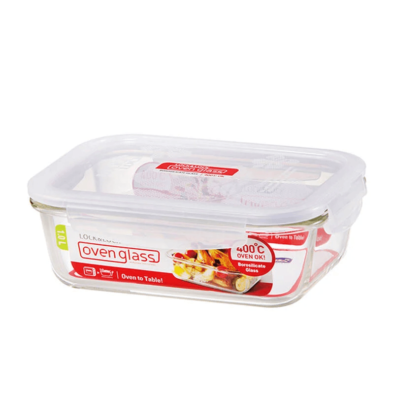 Hộp Thủy Tinh Chịu Nhiệt Hình Chữ Nhật Lock&Lock – 1.0 L (mã LLG445): Dung tích 1.000 ml, thân hộp làm từ thủy tinh borosilicate trong suốt, màu trong sáng; nắp nhựa PP với gioăng silicone và khóa 4 cạnh giúp chống rò rỉ. Thiết kế hình chữ nhật tiết kiệm không gian, phù hợp bảo quản thức ăn trong tủ lạnh, hâm nóng lại trong lò vi sóng và dùng phục vụ trực tiếp — lý tưởng cho gia đình hiện đại.