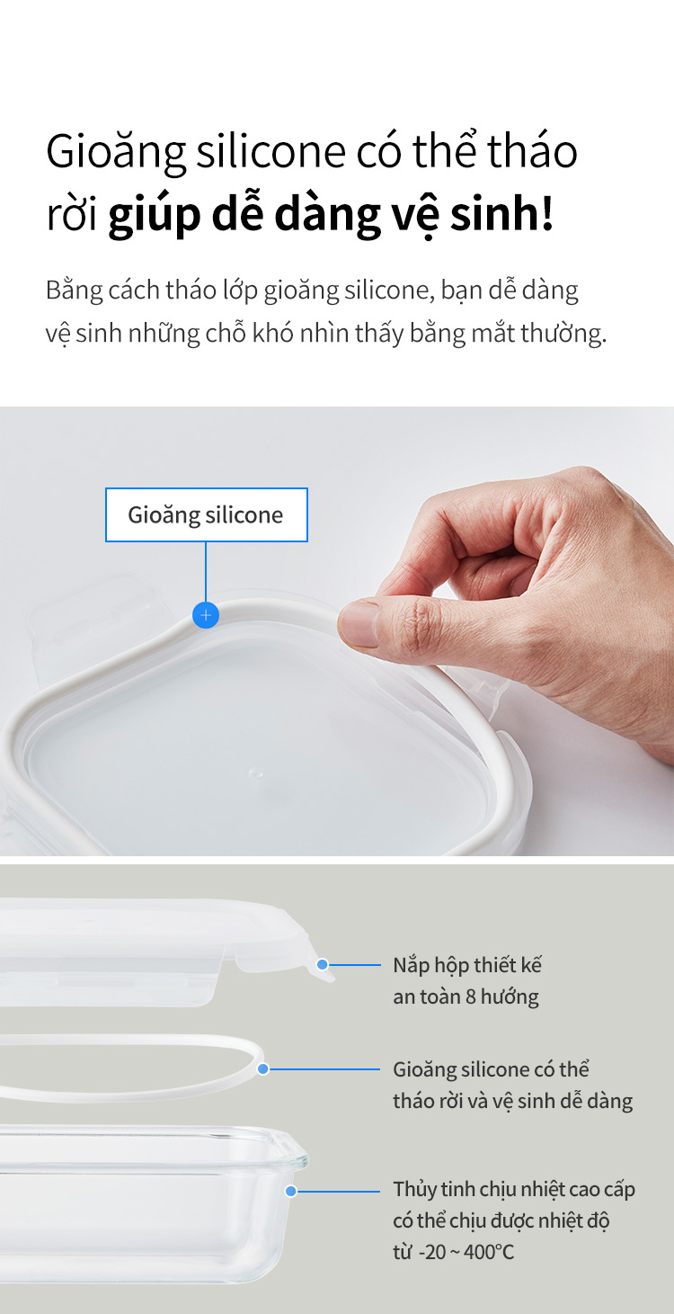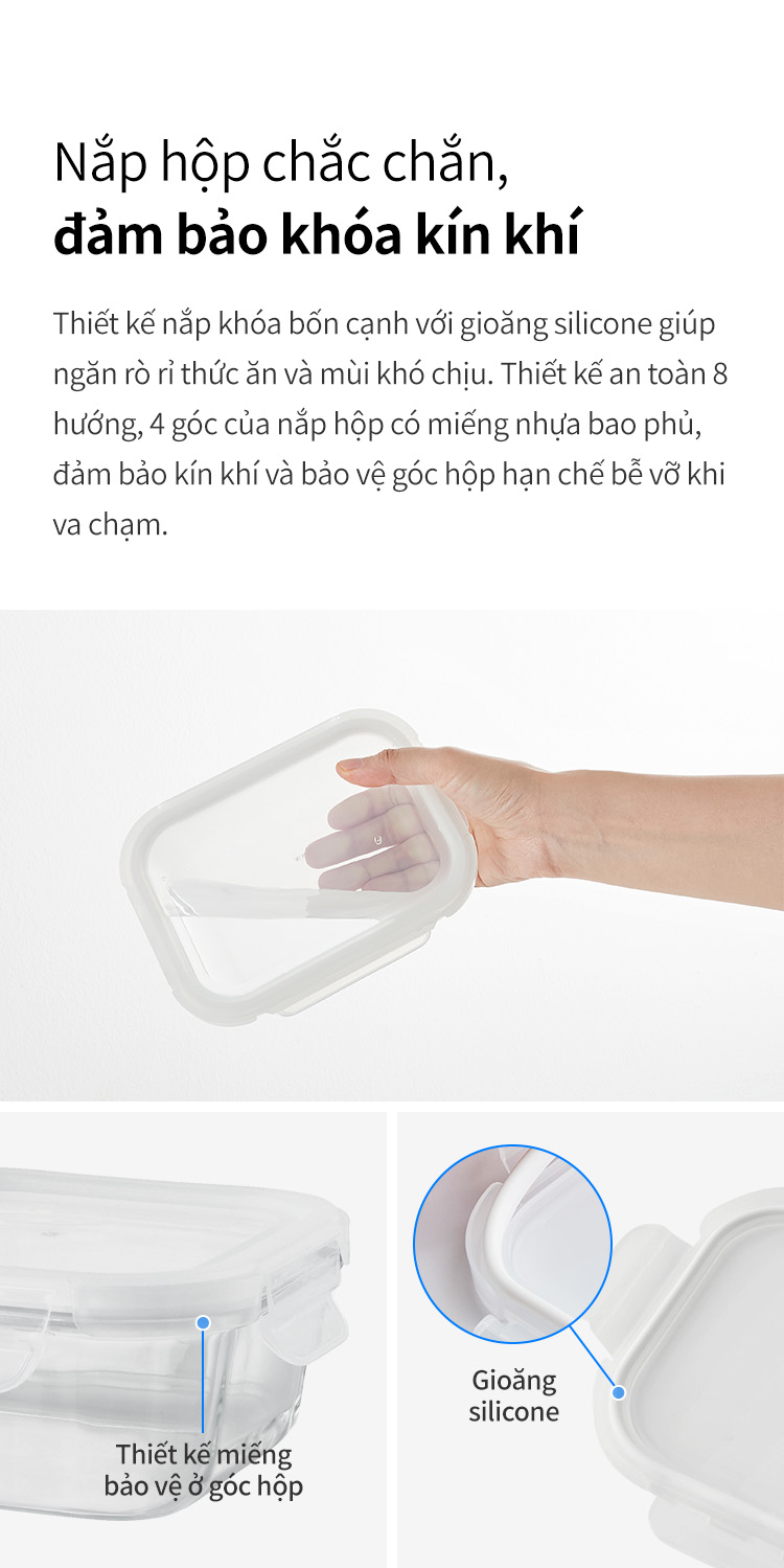 Nắp hộp và gioăng silicone khóa kín – giúp chống rò rỉ, giữ thực phẩm tươi ngon và không ám mùi.