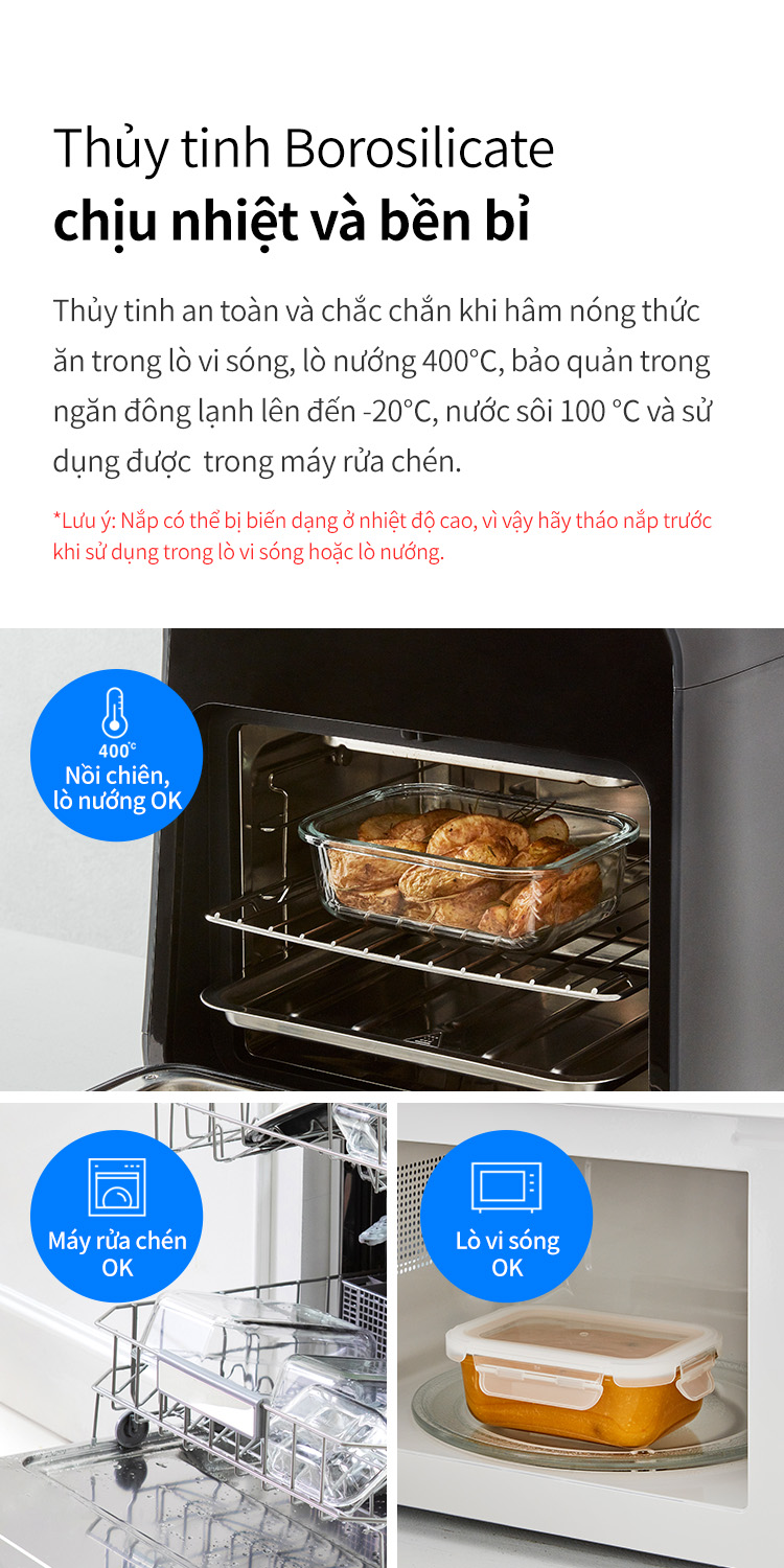 Thủy tinh chịu nhiệt cao giúp bạn yên tâm sử dụng trong lò vi sóng (theo hướng dẫn), bảo quản lạnh và vệ sinh dễ dàng.