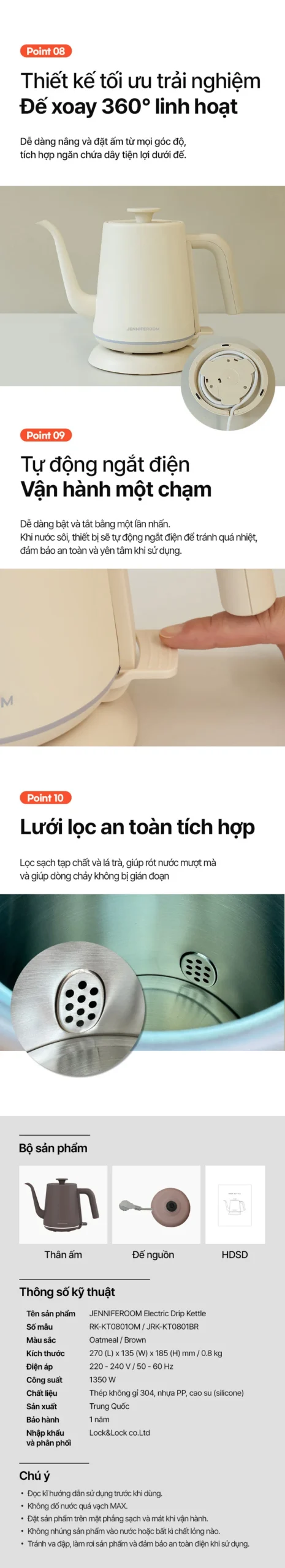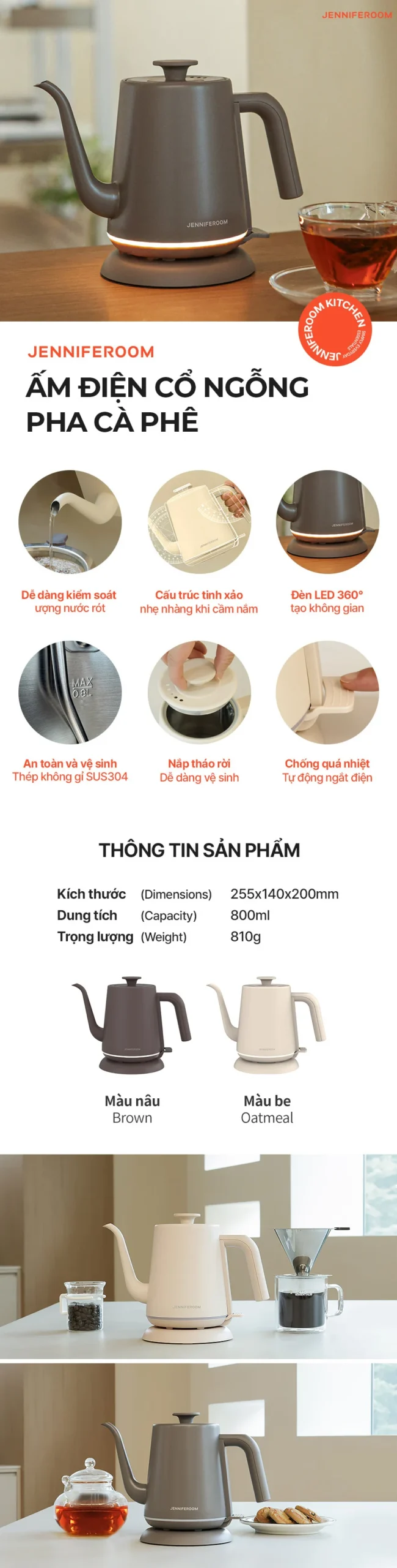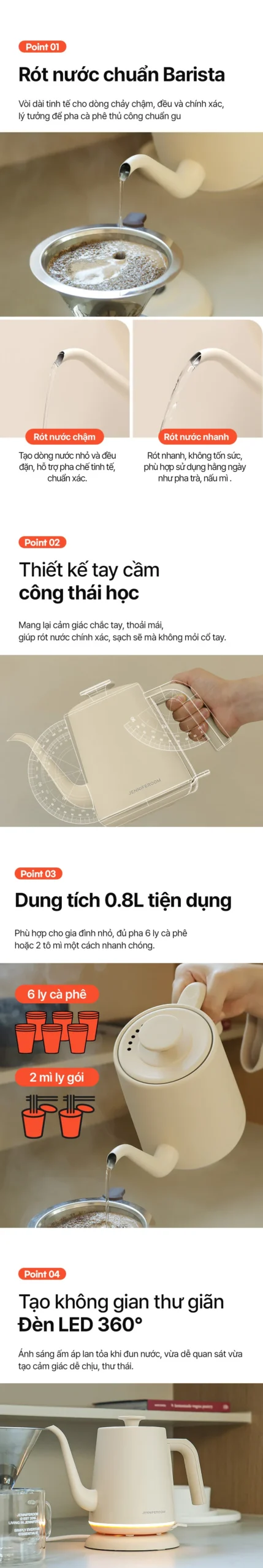 JRK-KT0801 – Ấm điện cổ ngỗng pha cà phê siêu tốc Jenniferoom Drip kettle 1350W, 0.8L