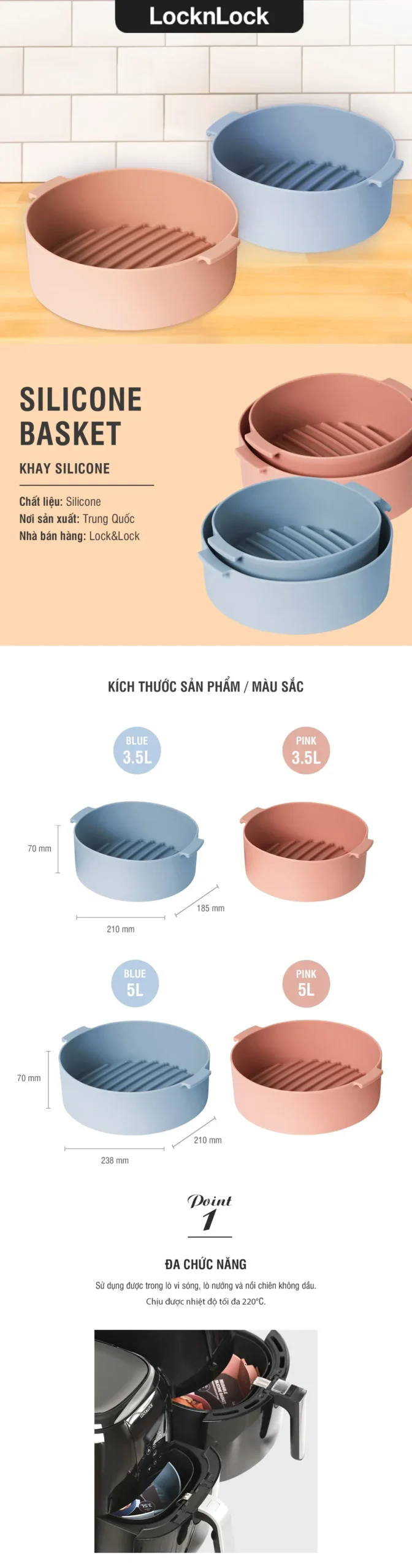 Khay Silicone Cho Nồi Chiên Không Dầu & Lò Vi Sóng LocknLock 210x185x70mm – 2 Màu (Xanh Dương, Hồng) – CKB003