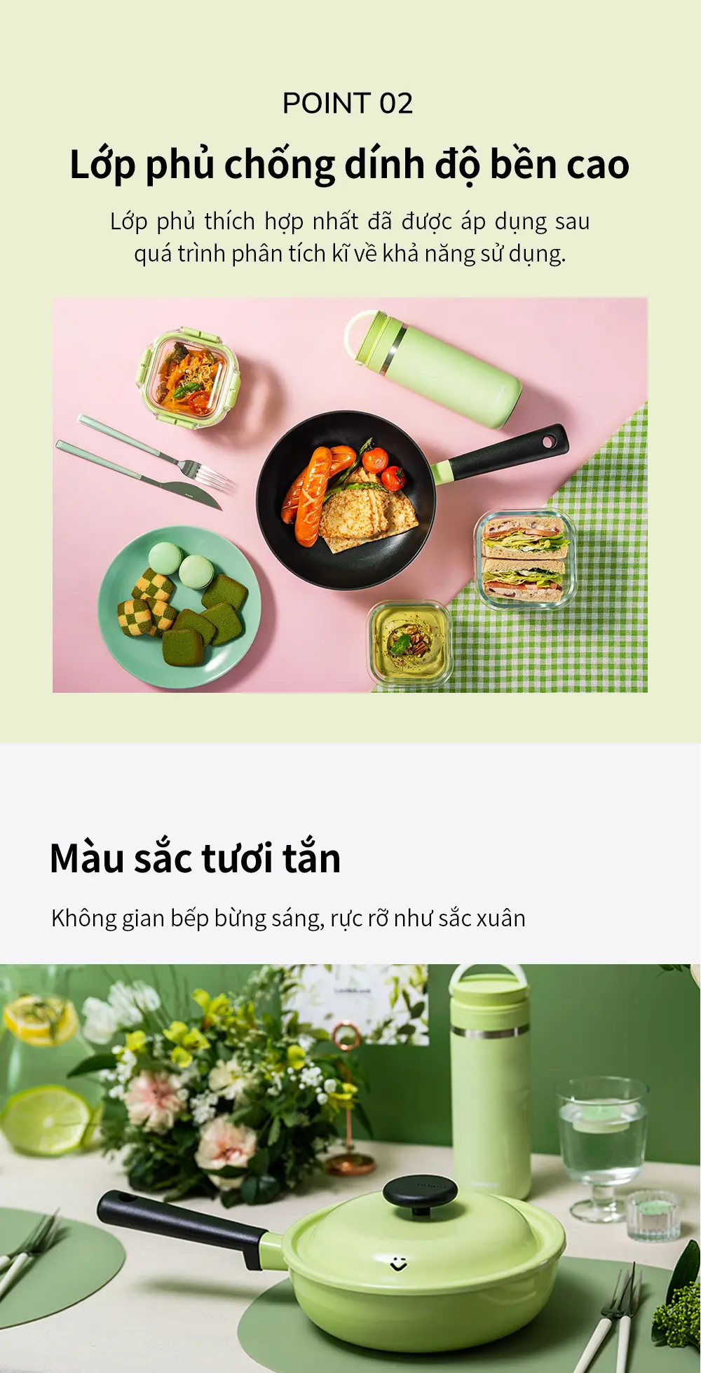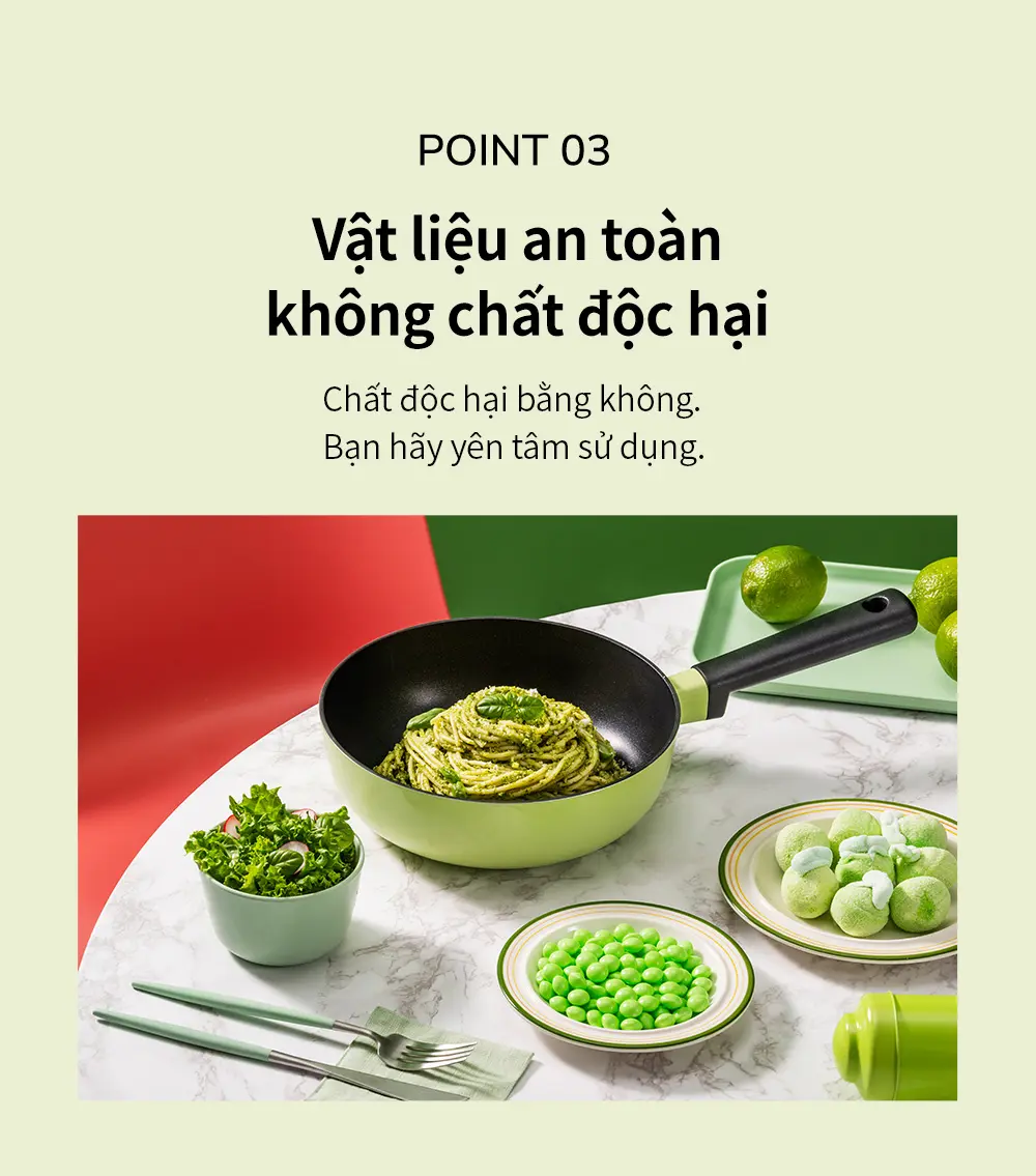 – Lớp phủ chống dính 3 lớp titan siêu bền, kỹ thuật được sử dụng trong lĩnh vực công nghệ cao như hàng không và thiết bị y tế, chảo có thể được sử dụng trong thời gian dài, thức ăn không bị dính dễ dàng; vì vậy, nấu ăn và vệ sinh tiện lợi hơn.