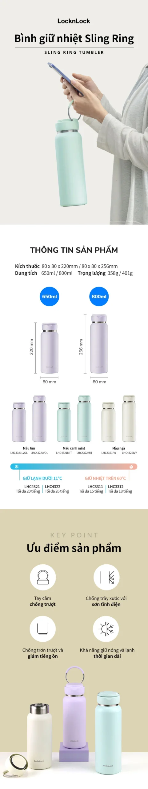 Bình giữ nhiệt LocknLock Sling Ring Tumbler 650ml – 800ml (Màu mint, tím nhạt, ngà)