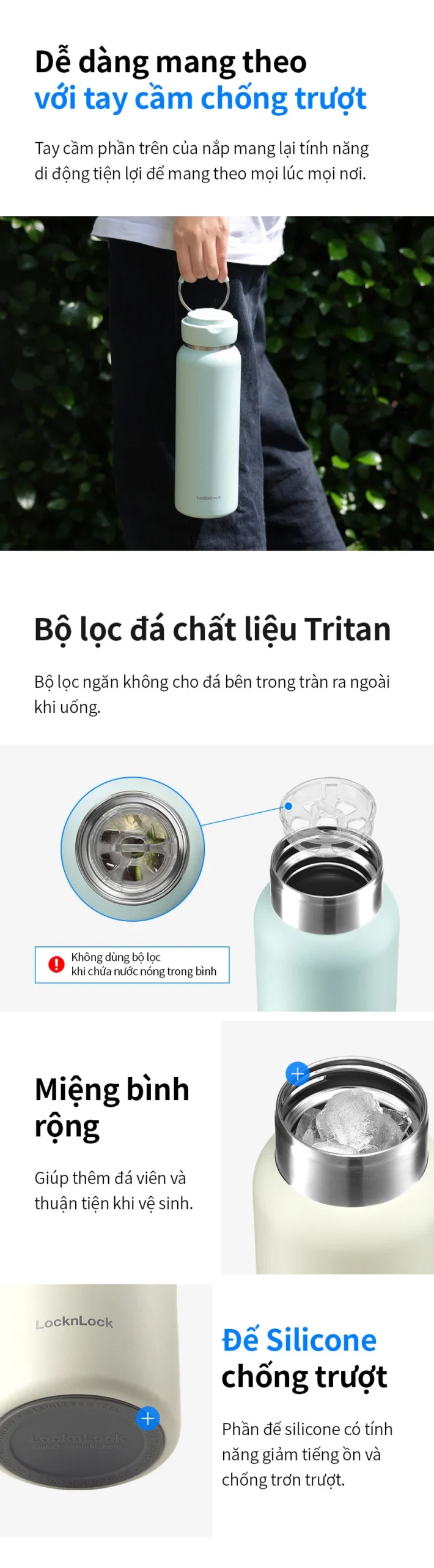 - Bộ lọc đá Tritan: Ngăn đá tràn ra ngoài khi uống. (Không dùng bộ lọc khí chứa nước nóng trong bình.)