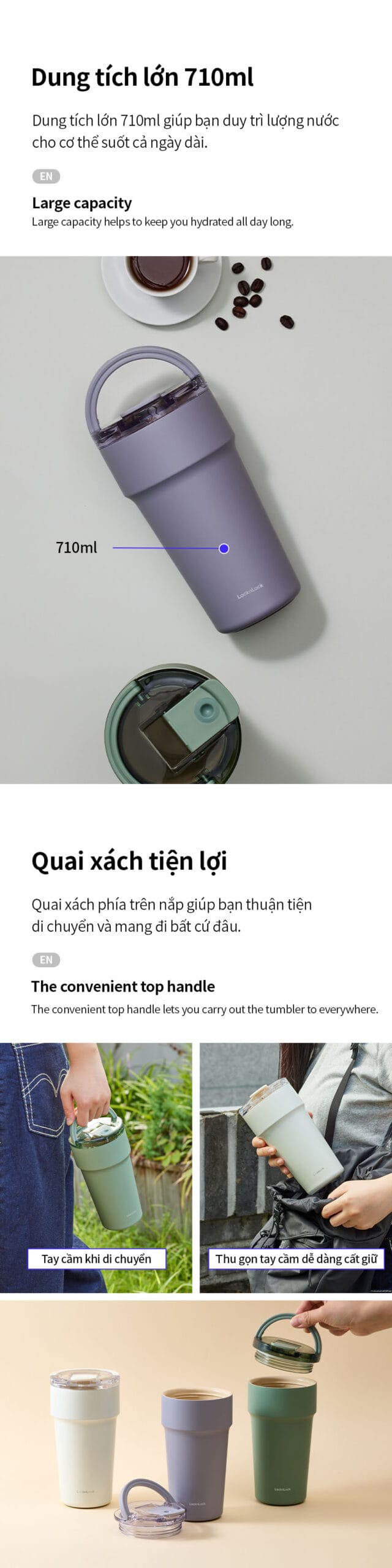 Ly giữ nhiệt LocknLock LHC4416 là lựa chọn lý tưởng cho những ai cần một sản phẩm vừa tiện dụng vừa đảm bảo an toàn sức khỏe. Với dung tích lớn 710ml, sản phẩm đáp ứng tốt nhu cầu sử dụng hằng ngày như uống nước, cà phê, trà hoặc các loại đồ uống yêu thích.