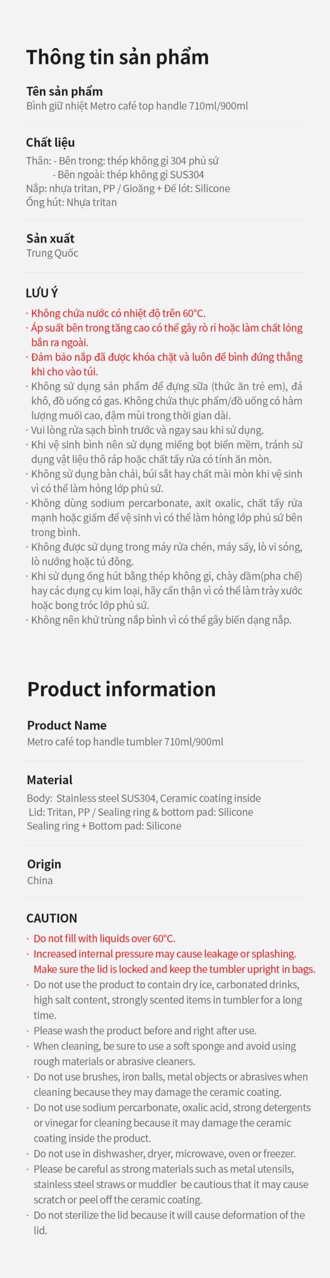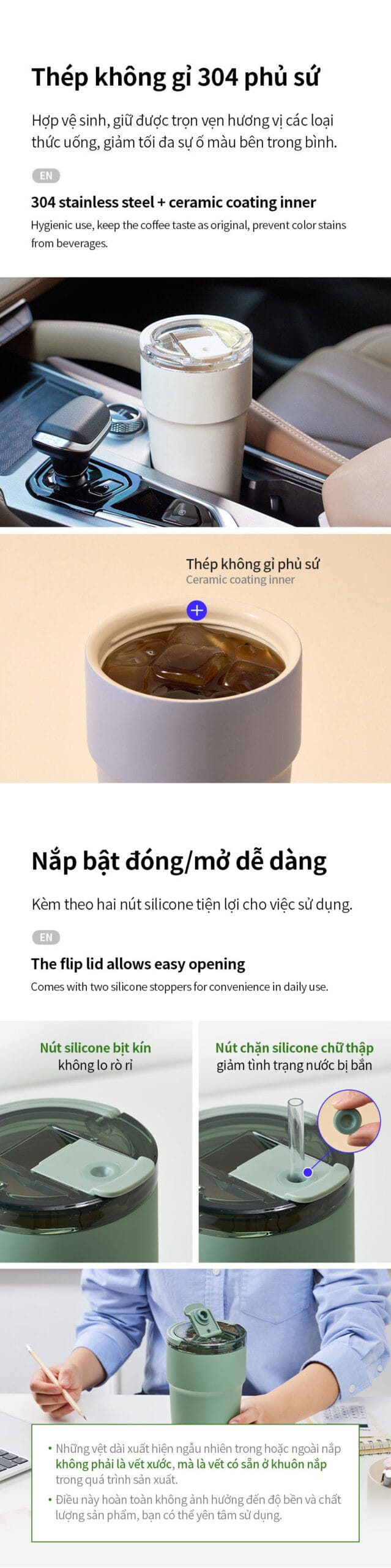 Thân cốc: bên trong thép không gỉ 304 phủ sứ, bên ngoài thép không gỉ SUS304