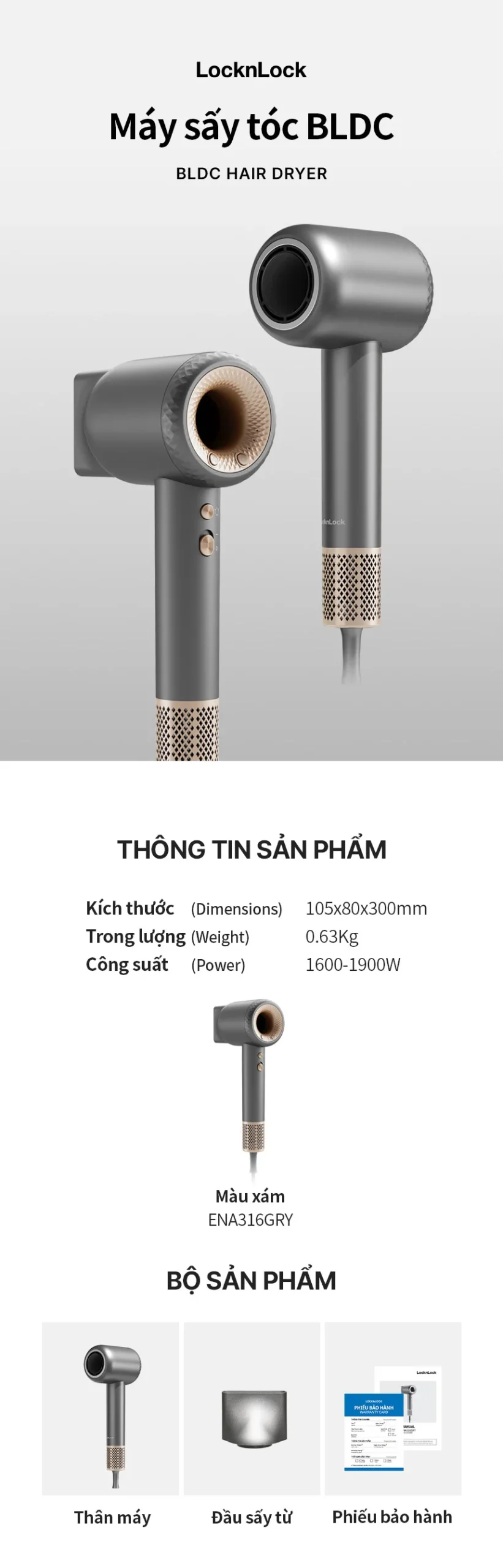 Máy sấy tóc ion âm LocknLock hair dryer đầu sấy từ 360 độ, chức năng tự làm sạch ENA316GRY