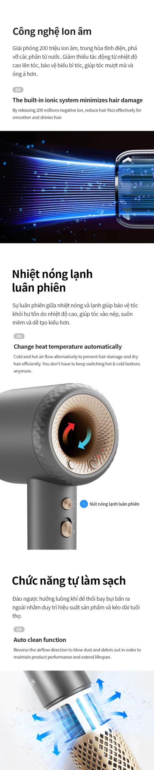 CÔNG NGHỆ ION ÂM: Giải phóng 200 triệu ion âm, trung hòa tĩnh điện, phá vỡ các phân tử nước. Giảm thiểu tác động từ nhiệt độ cao lên tóc, bảo vệ biểu bì tóc, giúp tóc mượt mà và óng ả hơn.