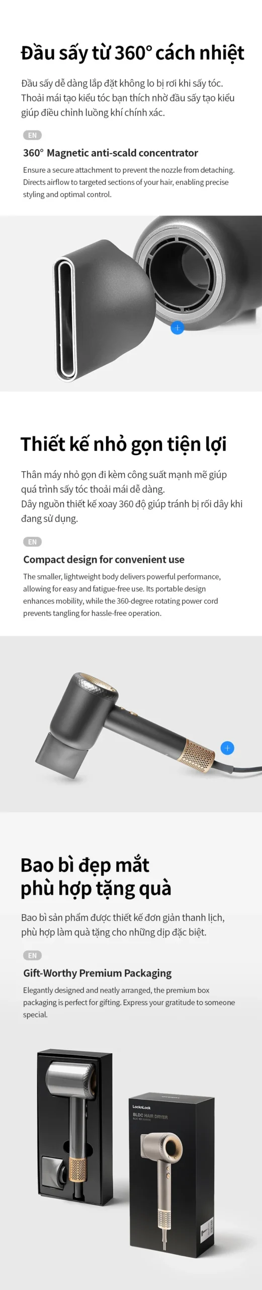 ĐẦU SẤY TỪ 360O: Lắp đặt dễ dàng và chắc chắn. Tập trung luồng khí, tạo kiểu dễ dàng hơn.