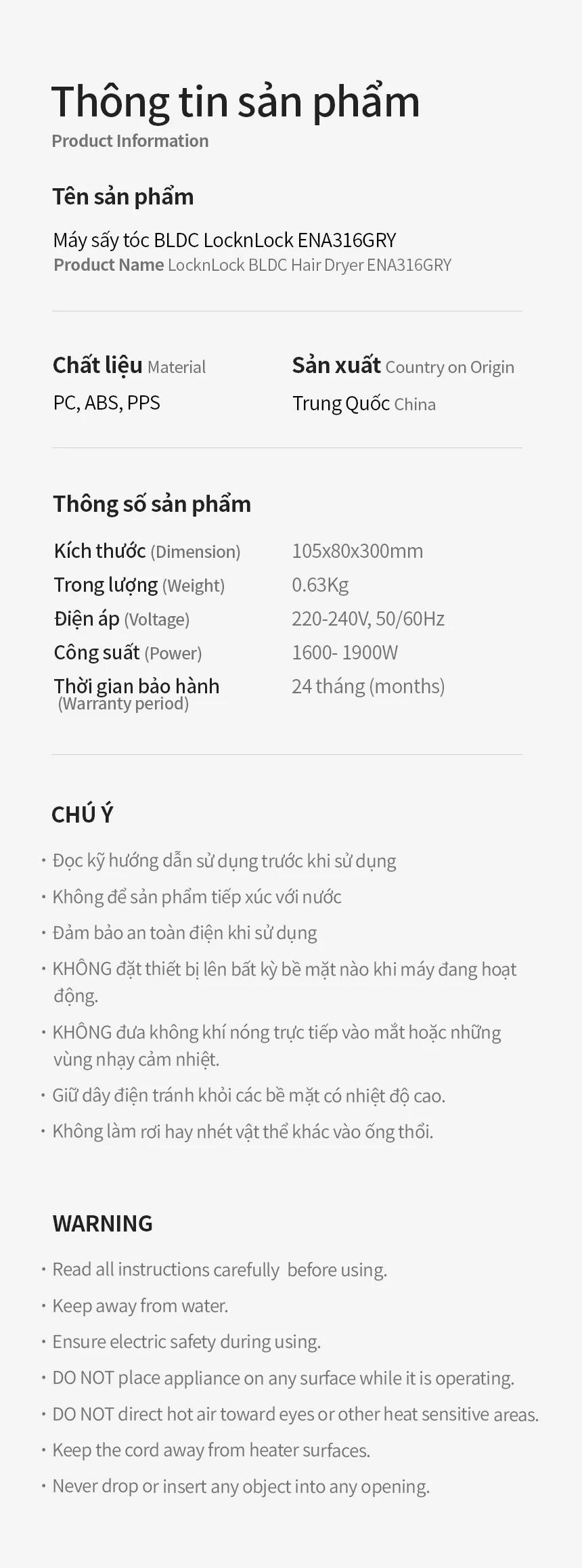 Thông số: 220-240V, 50/60Hz, 1600-1900W.
