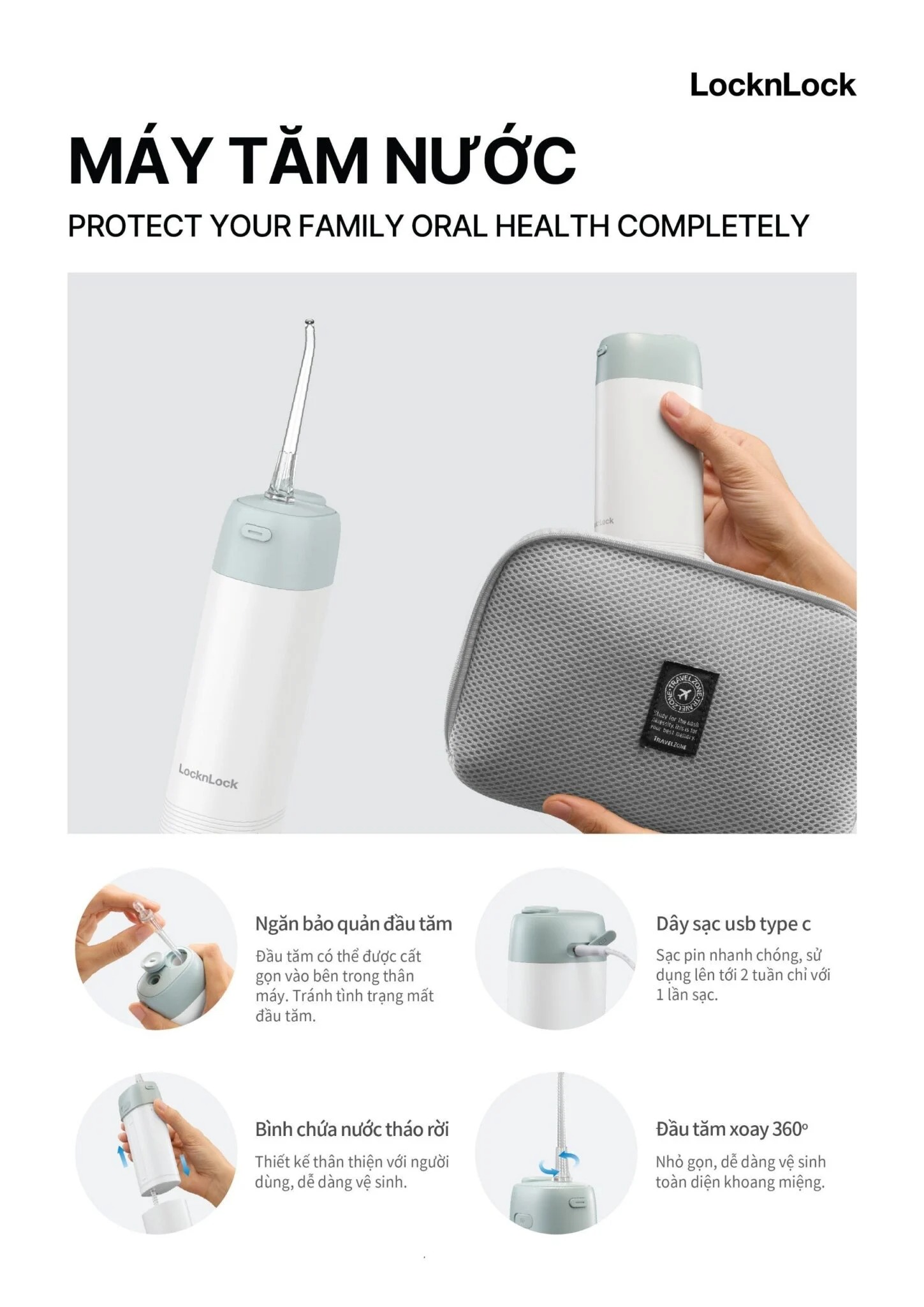 Máy tăm nước LocknLock ENR116MIT là giải pháp chăm sóc răng miệng hiệu quả, giúp làm sạch sâu mảng bám, thức ăn thừa và vi khuẩn trong khoang miệng. Với thiết kế màu Mint hiện đại, nhỏ gọn, sản phẩm mang lại trải nghiệm sử dụng tiện lợi cho cả gia đình.