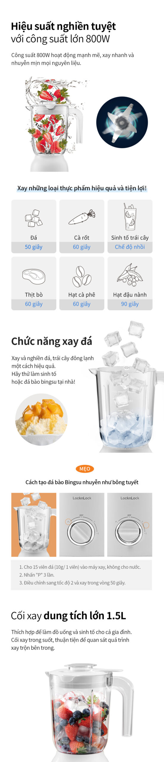 - Xay đá dễ dàng: Tích hợp chức năng xay và nghiền đá, phù hợp với trái cây đông lạnh, đảm bảo hiệu quả vượt trội.