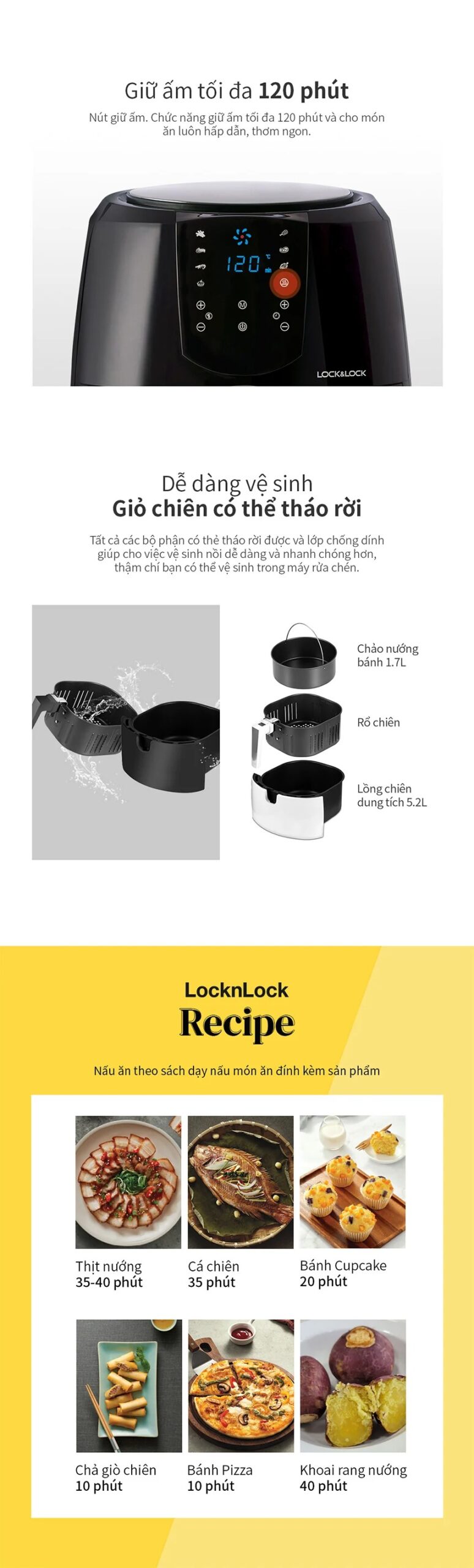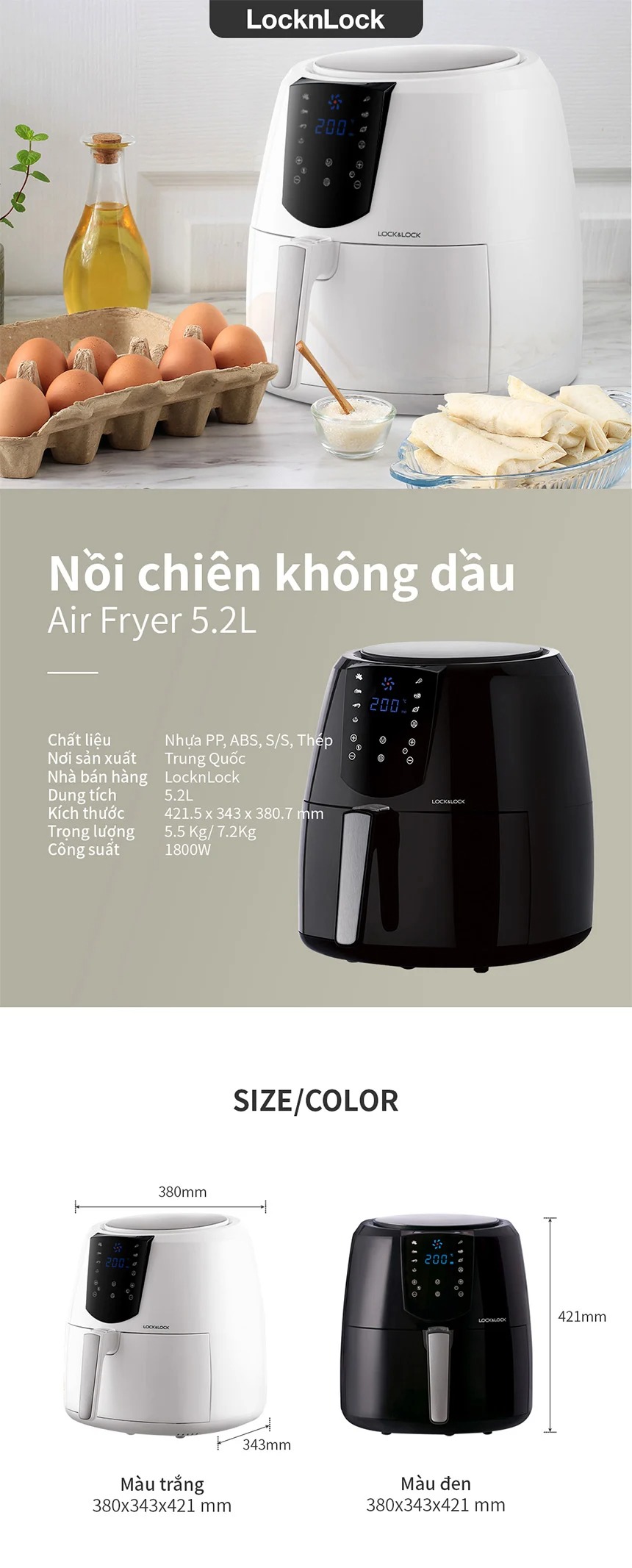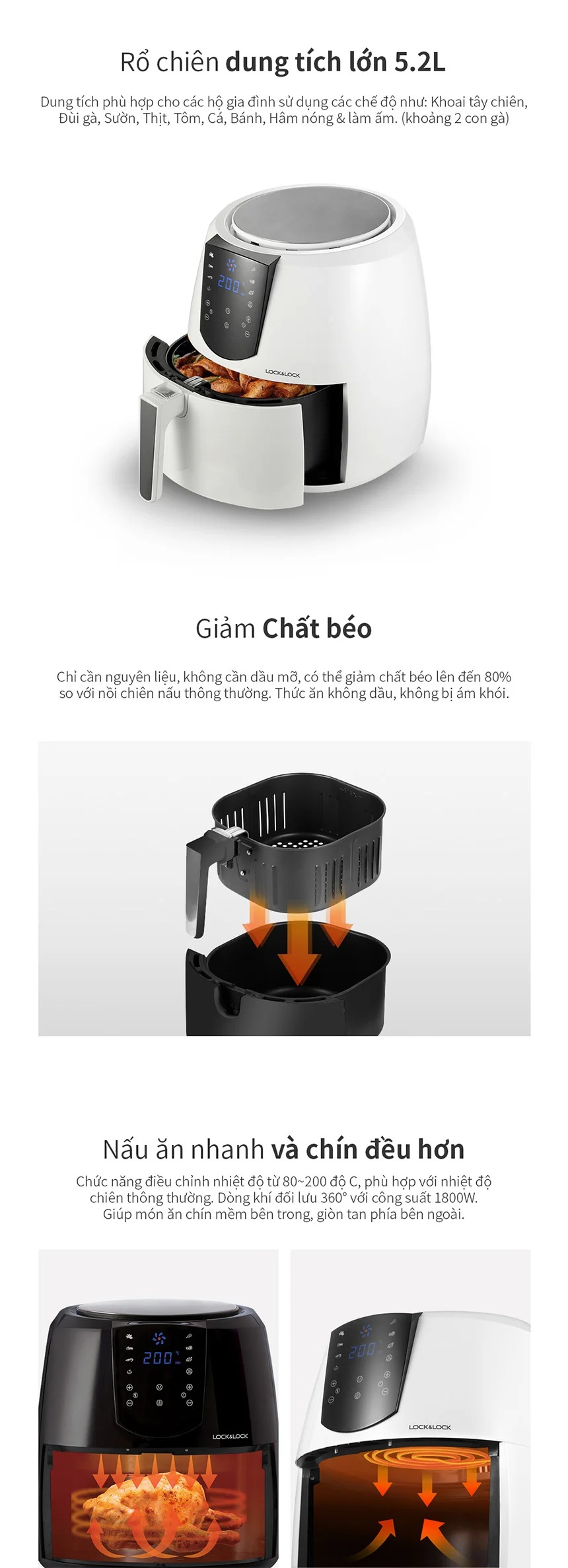 Nồi Chiên Không Dầu LocknLock Jumbo Plus Air Fryer – 5.2 L – EJF357 là lựa chọn hoàn hảo cho gia đình đông người, giúp chế biến món ăn giòn ngon, ít dầu mỡ và tiết kiệm thời gian nấu nướng.