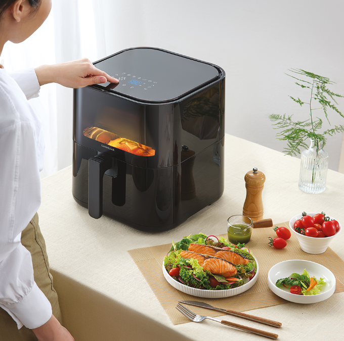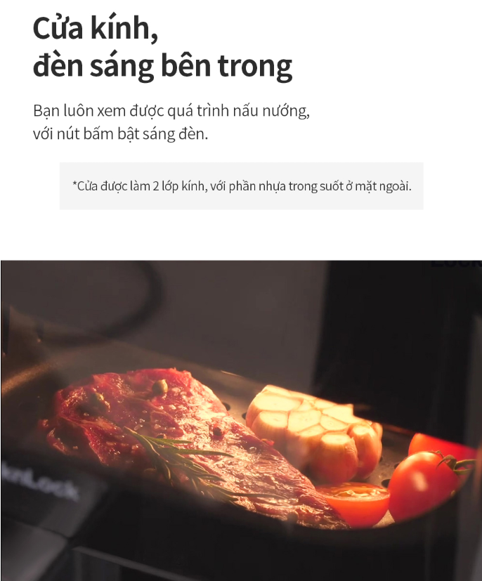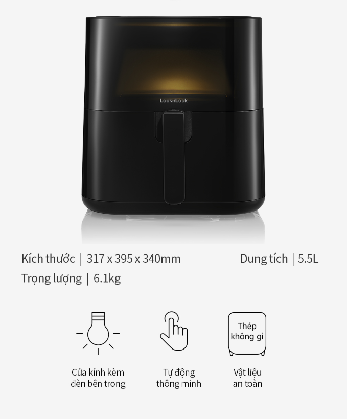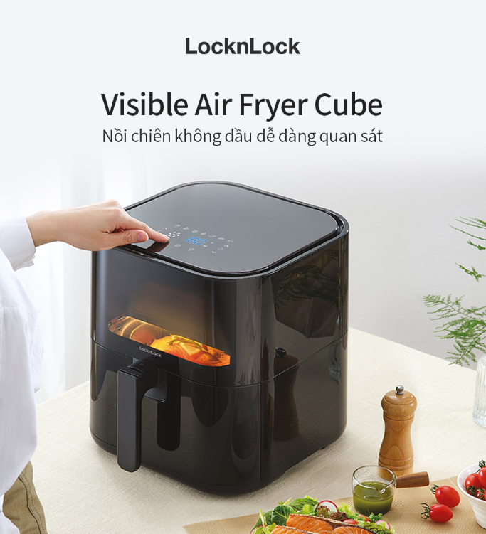Nồi Chiên Không Dầu LocknLock Visible Air Fryer Cube – 5.5 L – EJF996BLK mang đến trải nghiệm nấu ăn tiện lợi và hiện đại với thiết kế cửa kính trong suốt, giúp bạn dễ dàng quan sát món ăn trong suốt quá trình chế biến.