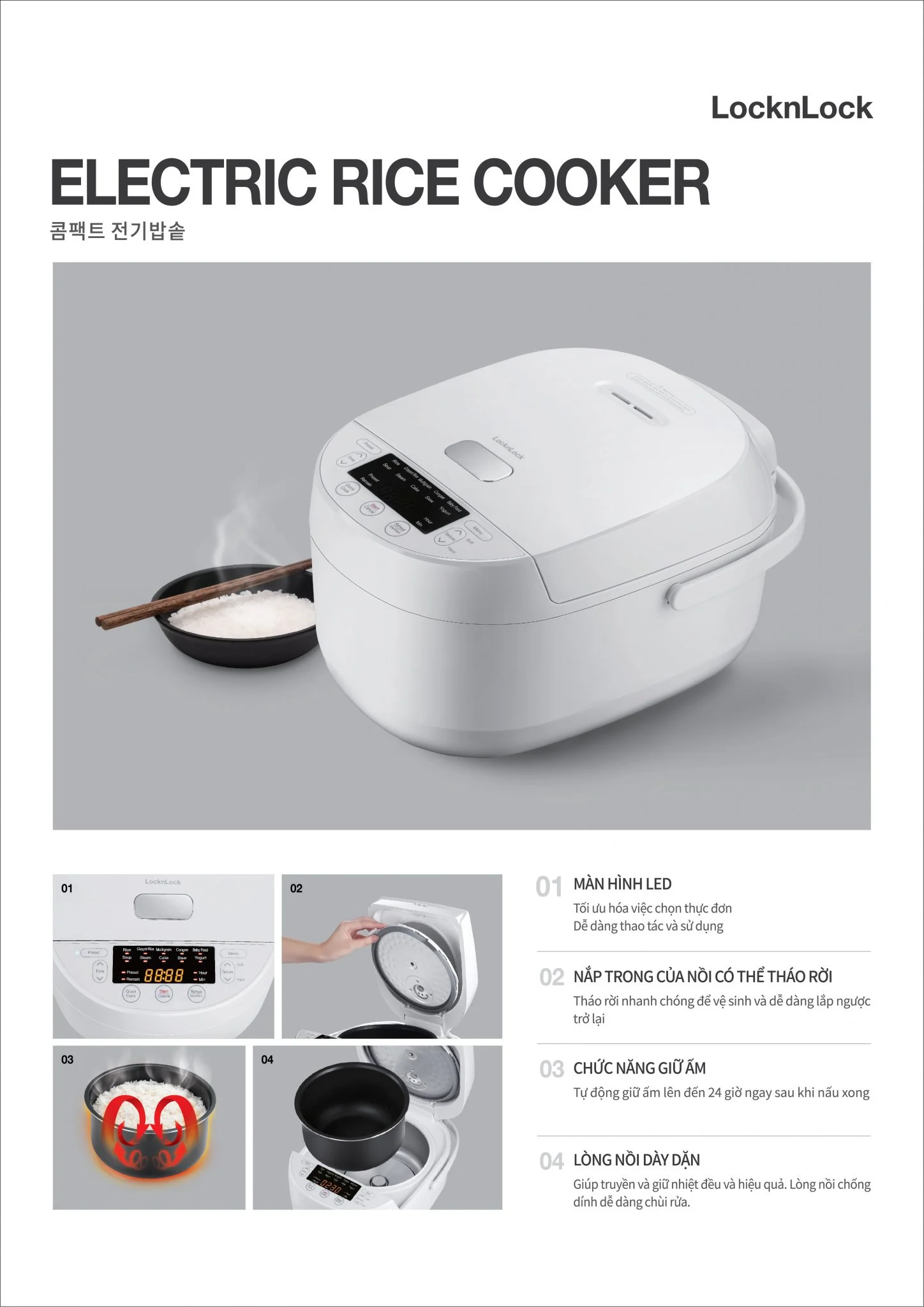 Nồi cơm điện LocknLock Electric Rice Cooker 1.0L – EJR311WHT mang đến sự tiện lợi trong việc nấu cơm hằng ngày với dung tích nhỏ gọn 1.0L, phù hợp cho gia đình ít người hoặc người sống độc thân. Công suất 590W giúp cơm chín đều, giữ trọn hương vị thơm ngon. Thiết kế hiện đại với gam màu trắng tinh tế, nồi còn được trang bị lòng nồi chống dính bền bỉ, dễ dàng vệ sinh sau khi sử dụng.